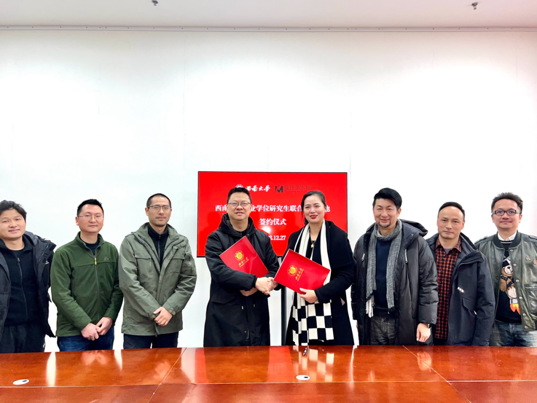 为深化学院专业学位研究生培养模式改革,强化专业学位研究生实践建设,提高人才培养质量,2023年12月27日,美术学院作为培养单位与重庆美术馆举行必赢优惠y272net专业学位研究生联合培养基地签约。重庆美术馆馆长王发荣、副书记蔡佳、副馆长唐德福、创作部主任蒋才,美术学院党委书记张瑜、副院长陈刚、校美术馆常务副馆长谢光跃等人参加本次仪式。