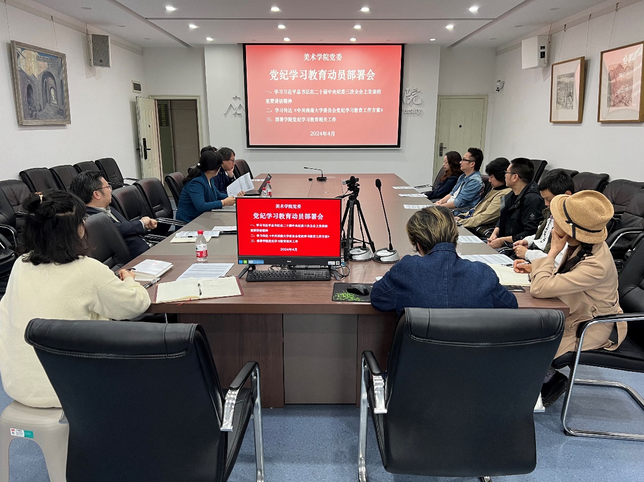 4月19日下午,学院党委在214会议室召开党纪学习教育动员部署会,传达上级党组织关于在全党开展党纪学习教育的要求,部署学院党委党纪学习教育系列工作。会议由党委书记张瑜主持,学院党委委员、党支部书记、工会主席、教学工作办公室主任等参会。